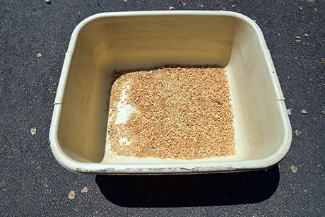 IMAGE: Hulled rice and chaff in the beige bus tray. This still needs to be winnowed before consumption.