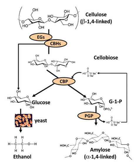 IMAGE: From Chun You, Hongge Chen, Suwan Myung, Noppadon Sathitsuksanoh, Hui Ma, Xiao-Zhou Zhang, Jianyong Li, and Y.-H. Percival Zhang, “Enzymatic transformation of nonfood biomass to starch.” The team’s two-step process first breaks cellulose into cellobiose, a compound made from a pair of glucose molecules, and then reassembles it. Between one third to half of the original cellulose can be transformed into amylose; the rest becomes glucose, which can be converted into ethanol for use as a biofuel by yeast.